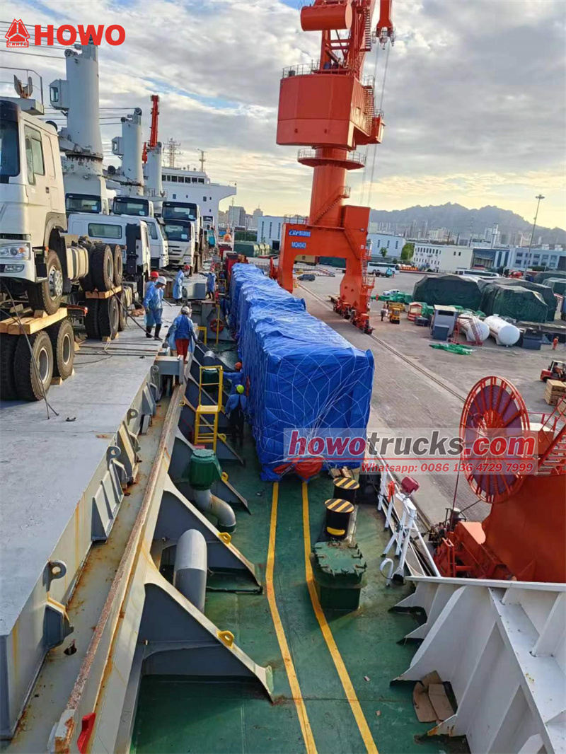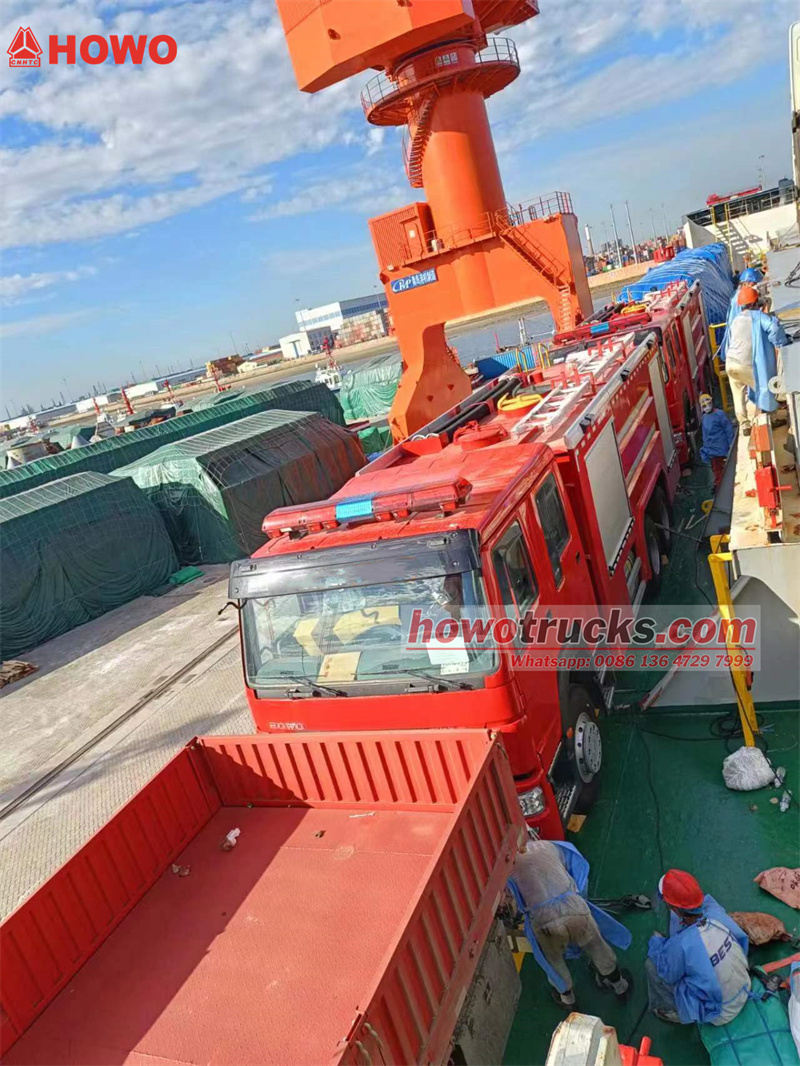 HOWO 6X4 12000L 폼 워터 소방 구조차 4대가 상하이 항에서 선적을 위해 적재되었습니다.