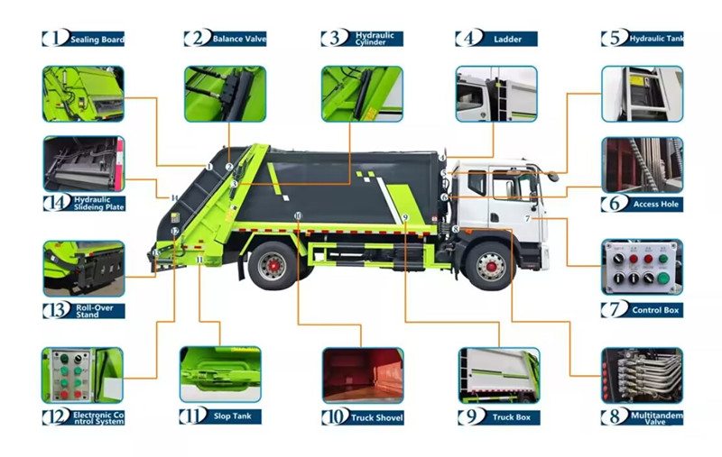 ●10m³ 후방 적재식 압축기는 주로 쓰레기 용기, 적재 장치, 압축 푸시 플레이트, 유압 시스템, 전자 제어 시스템 및 테일게이트로 구성됩니다.