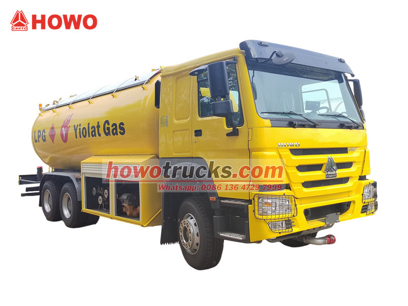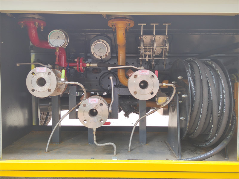 탱크 부속품: HOWO LPG 충전 트럭은 펌프, 유량계, 호스릴, 비상 차단 밸브를 포함한 완벽한 충전 시스템과 레벨 게이지, 온도계, 압력 게이지, 안전 밸브와 같은 필수 안전 장치를 갖추고 있습니다.