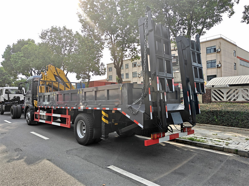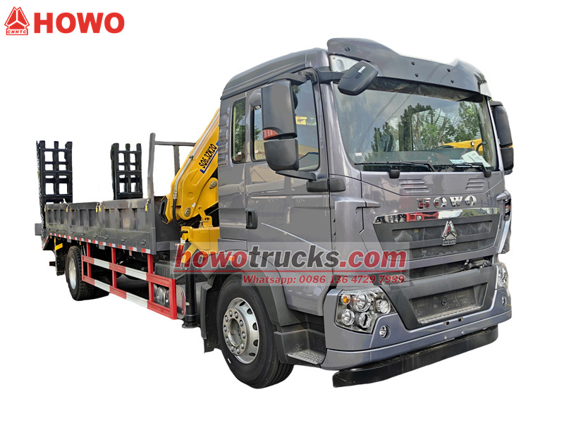 ♦ Howo 4x2 화물 트럭은 6톤 너클 붐 크레인(토크 10톤/높이 8.6m)과 20톤 평판 운반 기능을 갖추고 있습니다..