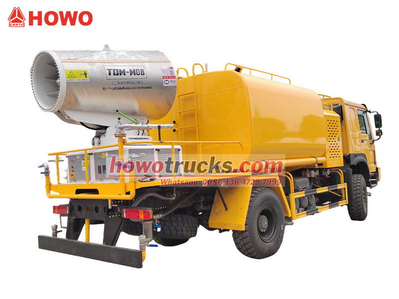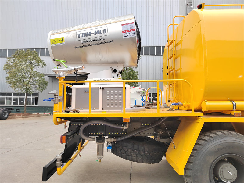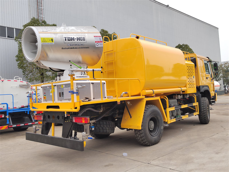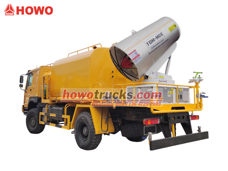 HOWO 4×4 워터캐논 트럭은 HOWO 사륜구동 섀시를 기반으로 제작되었으며, 300마력 엔진과 4륜구동 시스템을 탑재하여 험난한 지형에서도 탁월한 성능을 발휘합니다. 90개의 노즐이 장착된 초장거리 80m 워터캐논은 최대 20,000㎡의 면적에 20~200μm의 미세한 물안개를 분사할 수 있습니다. 10,000L의 대용량 물탱크와 고압 분사 시스템을 결합하여 도로 먼지 저감, 건설 현장 먼지 억제, 농업용 살포 등 다양한 작업에 효율적으로 활용됩니다. 특히 광산, 항만, 도시 환경 보호 등 분진 제어 분야에 적합합니다.