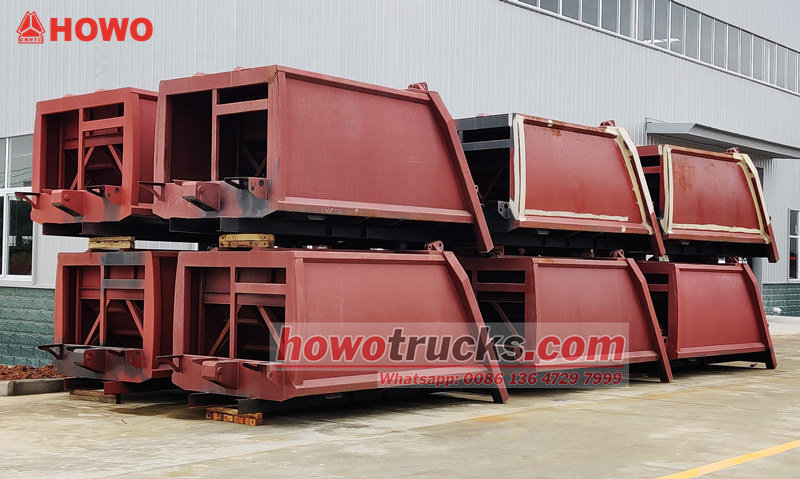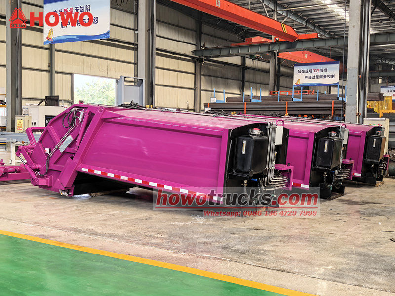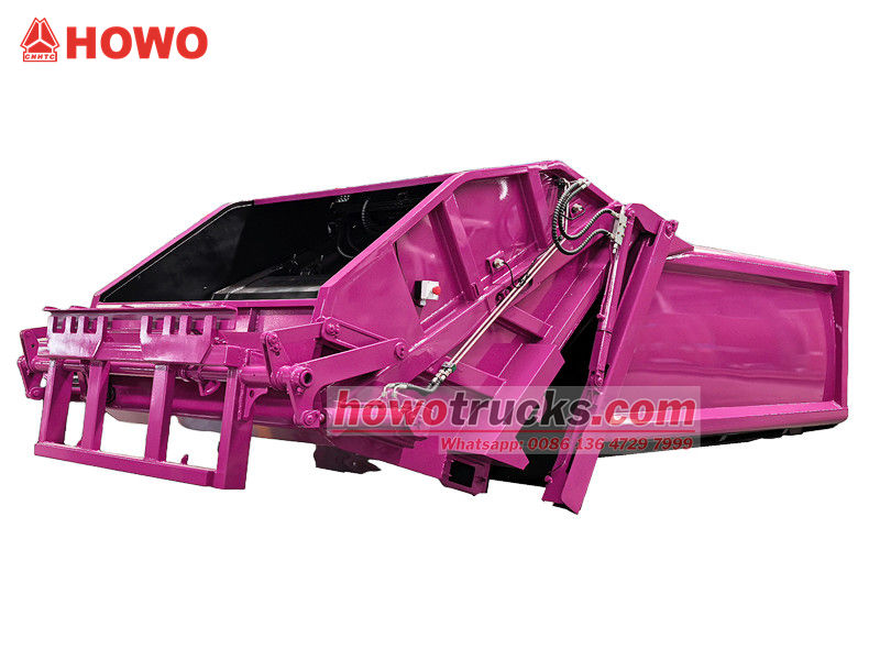 Howo 8cbm 압축 쓰레기 수거 차량 상부 구조 (후방 적재식 압축 트럭 상부 차체, 8cbm 쓰레기 압축 트럭 상부 차체 키트, 쓰레기 압축 트럭 상부 구조, 폐기물 압축 트럭 상부 차체 키트, 후방 적재식 폐기물 수거 트럭 키트 등으로도 불림) 상단부는 8cbm의 쓰레기통이고, 후면은 버킷 플립 메커니즘을 갖추고 있으며, 트럭 적재 및 하역에는 세 가지 작동 방식이 있습니다.